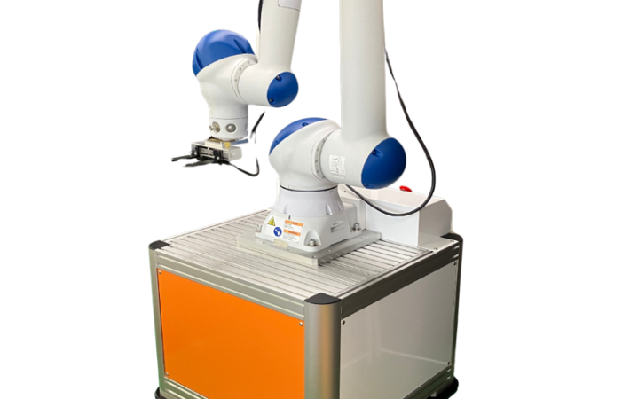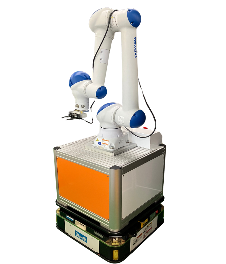ダイヘン製AMR「AiTran」に安川電機製人協働ロボット「MOTOMAN-HC10」を搭載した移動型人協働ロボット「新型AGBOT」は、ロボットと無人走行台車を組み合わせることで自ら工程間搬送や機械間搬送を行い、組み立てや治具の投入・排出など、複数工程を自動化します。